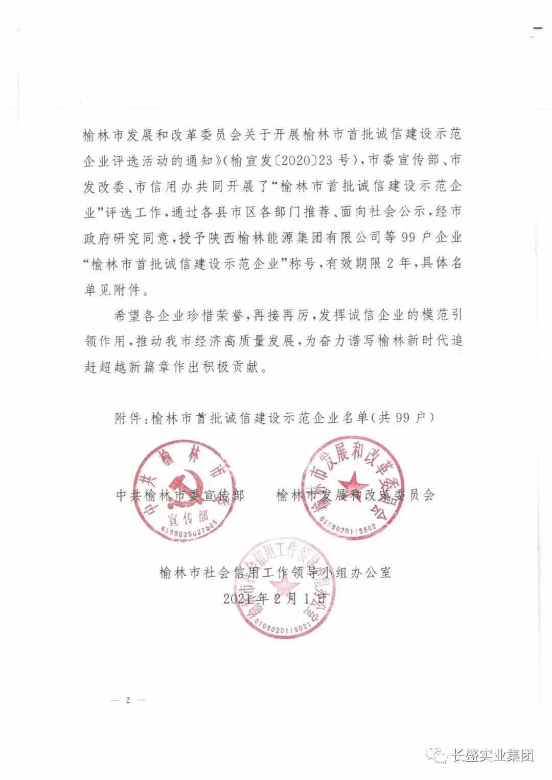 根據(jù)《陜西省企業(yè)信用建設示范創(chuàng)建工作方案》(陜發(fā)改財金〔2019〕1706號)和《中共榆林市委宣傳部 榆林市發(fā)展和改革委員會關于開展榆林市首批誠信建設示范企業(yè)評選活動的通知》(榆宣發(fā)〔2020〕23號),中共榆林市委宣傳部、榆林市發(fā)展和改革委員會、榆林市社會信用工作領導小組辦公室組織開展了“榆林市首批誠信建設示范企業(yè)”評選工作,經(jīng)各縣市區(qū)政府,市工信局、市市場監(jiān)管局、市生態(tài)環(huán)境局、市應急局等行業(yè)主管部門初步審核,同時向市中級法院、公安局、稅務局等相關部門征求意見,專家評審委員會評審,并通過榆林市信用協(xié)會工作小組嚴格評審和實地考察驗收確定。經(jīng)市政府研究同意,擬授予陜西榆林能源集團有限公司等99戶企業(yè)“榆林市首批誠信建設示范企業(yè)”的稱號。