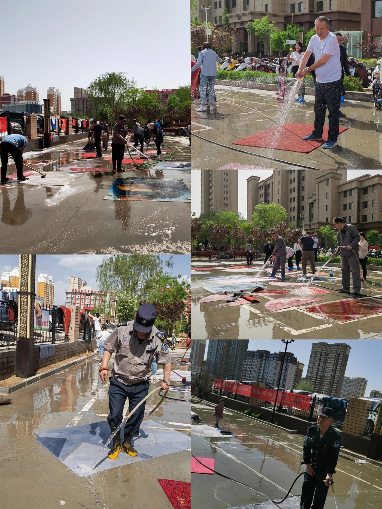活動(dòng)當(dāng)天,天氣晴好,盛景雅苑物業(yè)服務(wù)中心的客服人員、保潔人員、工程人員和保安人員齊齊上陣,橫幅一掛,熱情高漲。大家把早早準(zhǔn)備好的刷子、清潔劑、洗衣粉、高壓水槍都快速的帶到活動(dòng)現(xiàn)場(chǎng),一眨眼的功夫,小區(qū)的“業(yè)主家人們”也陸續(xù)將自家的地墊拿到活動(dòng)現(xiàn)場(chǎng),一一鋪開(kāi),物業(yè)人員用高壓水槍等清洗工具熟練地對(duì)“業(yè)主家人們”的地墊進(jìn)行清洗起來(lái)。通過(guò)物業(yè)工作人員的洗、刷、沖、晾、曬等環(huán)節(jié),將原本帶有泥漬的地墊變得煥然一新。