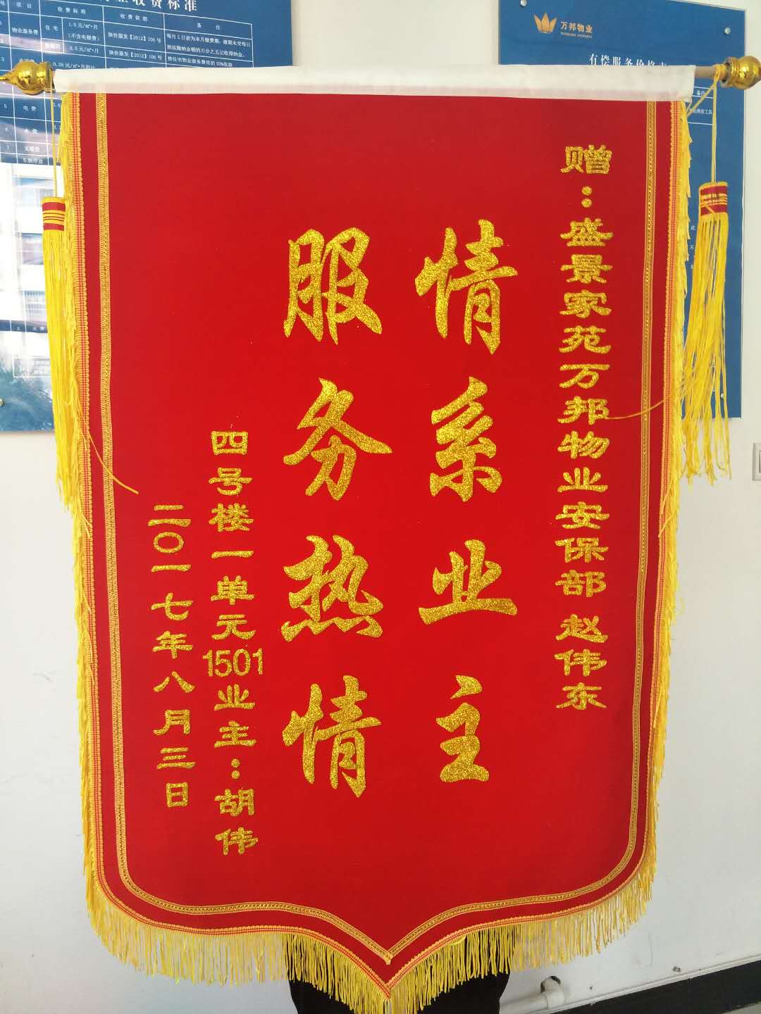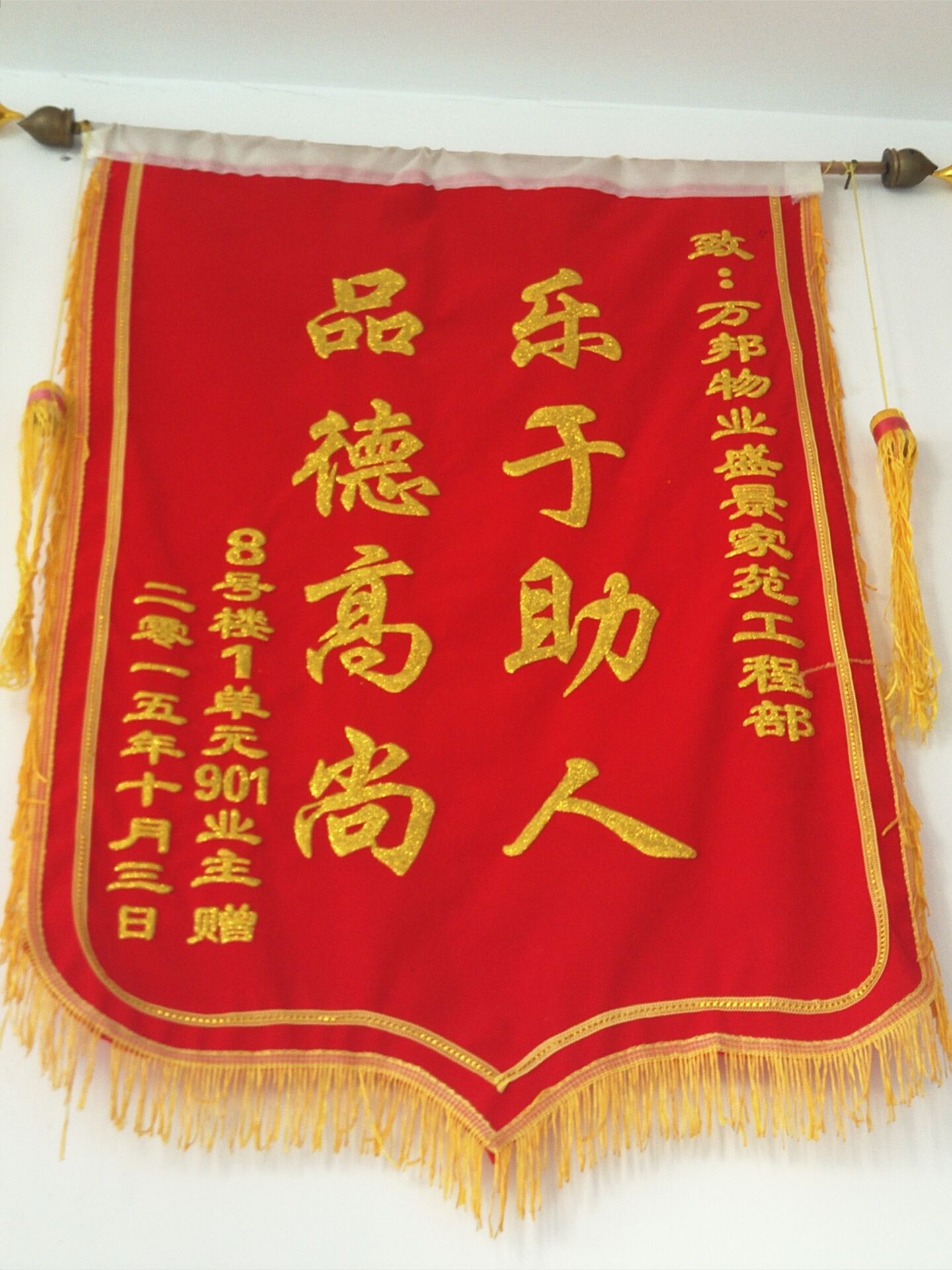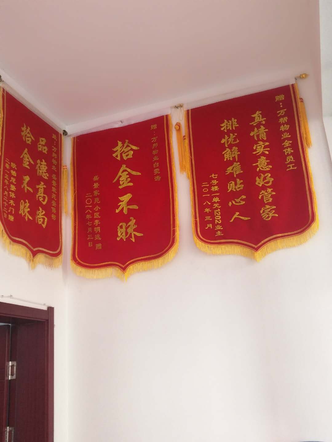 近年我們的榮譽(yù)墻逐漸被錦旗覆蓋!也讓全體工作人員感到了自己身上的那份責(zé)任,更加激發(fā)了大家的工作熱情。今后我們將做好“真情實(shí)意好管家,排憂解難貼心人”為業(yè)主提供更好的服務(wù)。  |