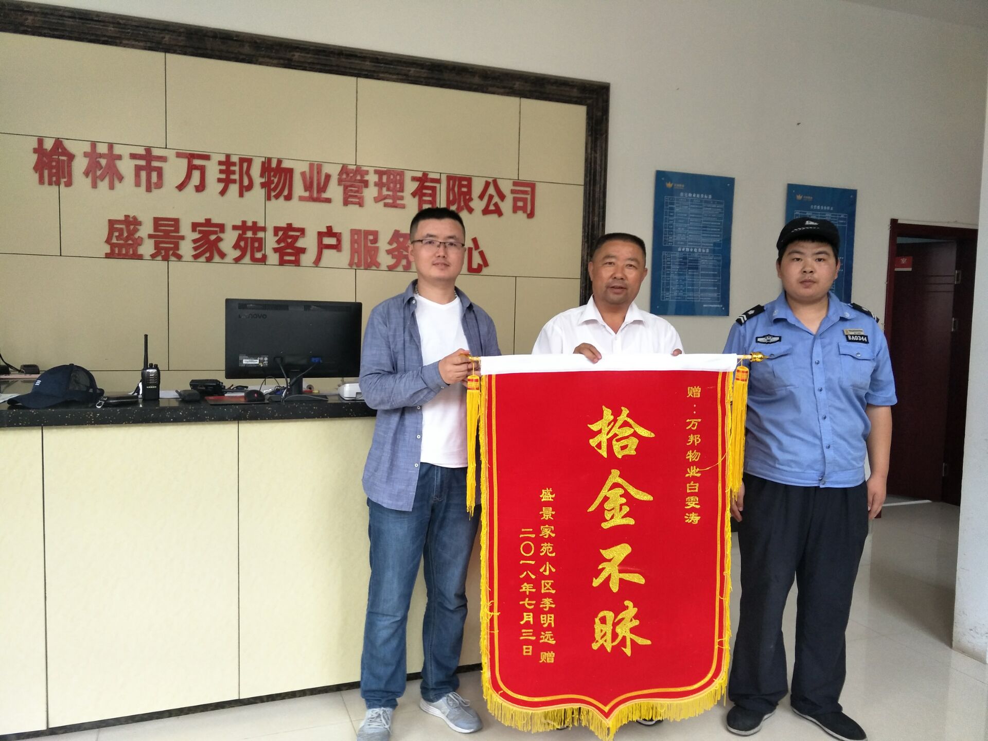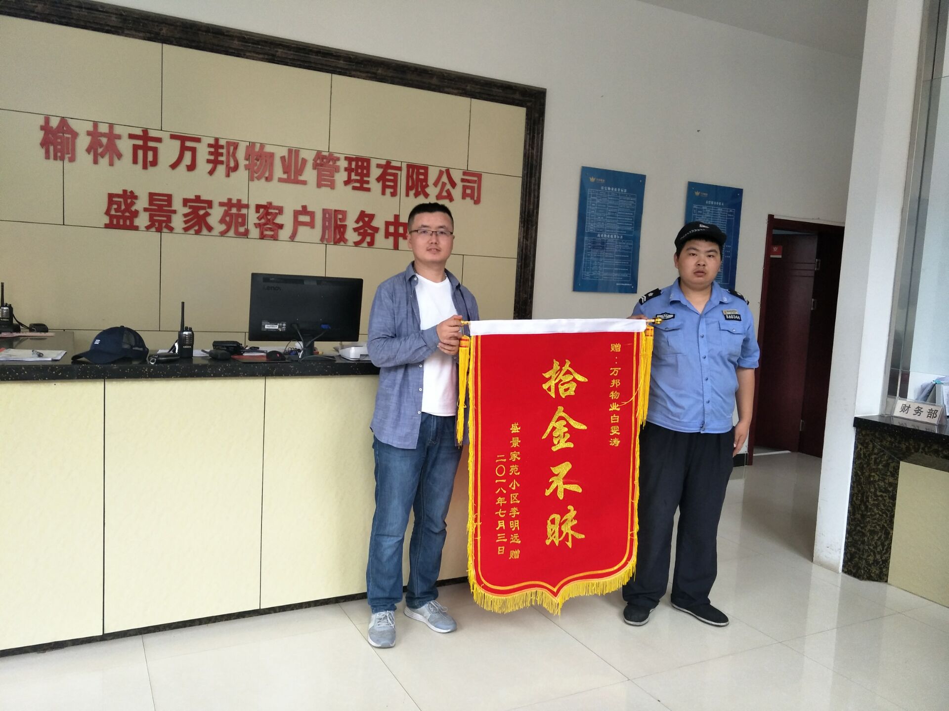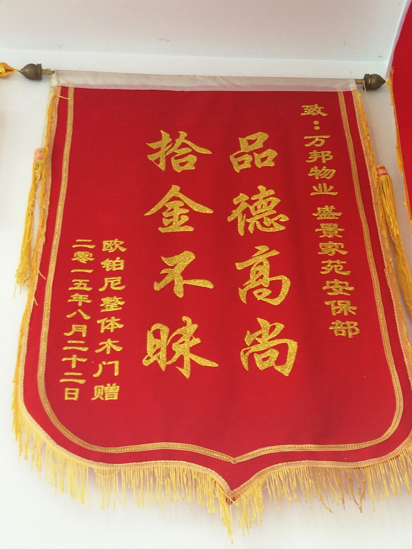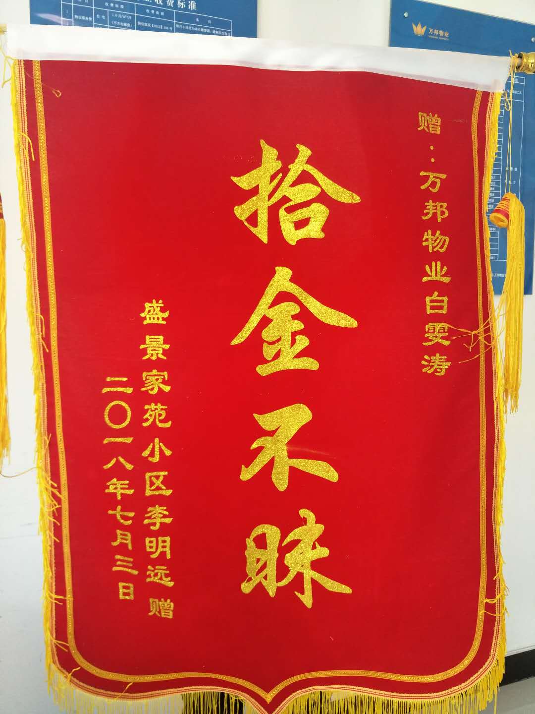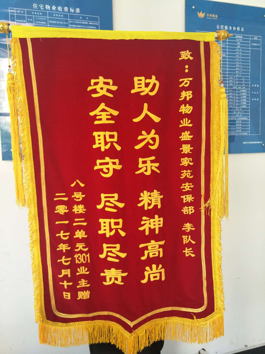 同時(shí)我安保人員多次拾撿到業(yè)主和客戶貴重財(cái)物,并在第一時(shí)間將遺失財(cái)物歸還,多次獲“品德高尚 拾金不昧”、“助人為樂,精神高尚,安全職守,盡職盡責(zé)”、“情系業(yè)主 服務(wù)熱情”等錦旗;