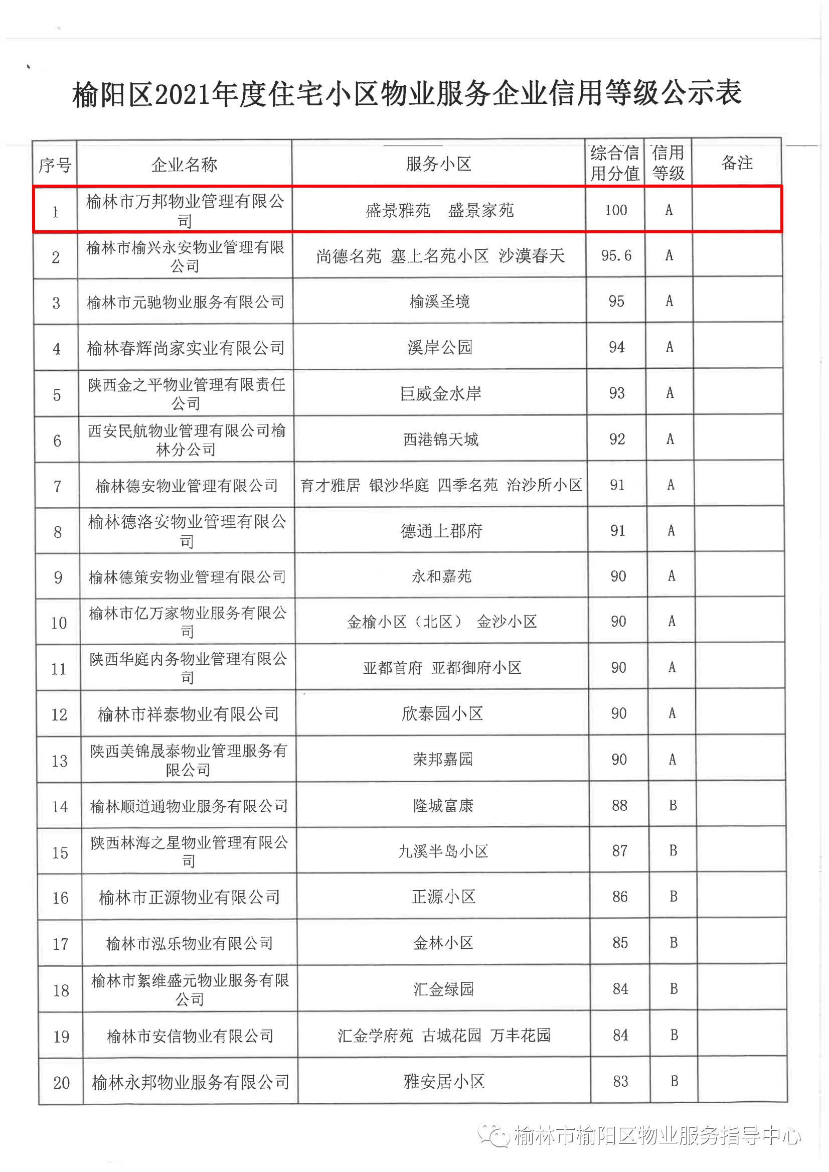 近日,榆陽區發布2021年度住宅小區物業服務企業信用等級公示,榆林市萬邦物業管理有限公司憑借歷年來在物業行業的精耕細作和誠信經營,順利通過信用等級評定,以綜合信用分值100分、信用等級A級位居榜首。